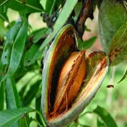 L’Arbre : Originaire d’Asie Centrale, l’amandier apparaît pour la première fois en France au 16ème siècle. Il est cultivé dans les pays méditerranéens et en Californie. Cet arbre est de de 6 à 12 mètres. Le fruit est une drupe vert clair et veloutée renfermant généralement une seule graine : l’amande. De cette dernière, on tire l’huile d’amande douce pour adoucir la peau.